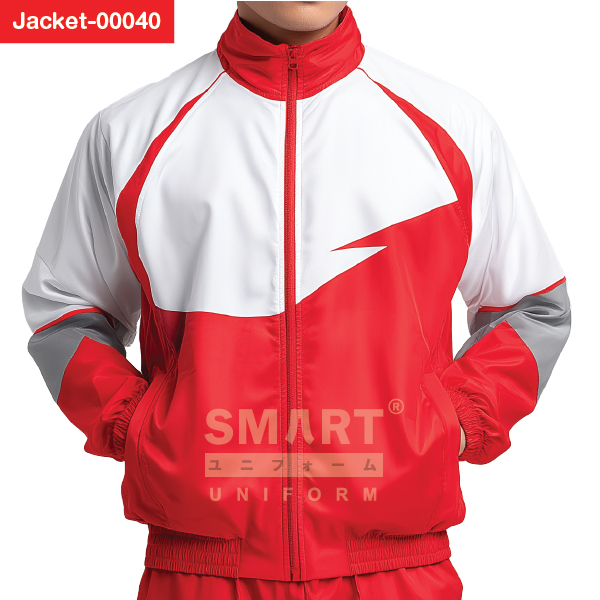 เสื้อแจ็คเก็ตยูนิฟอร์มสีแดงตัดต่อขาวพร้อมแถบเทา ออกแบบให้รองรับการใช้งานจริงของทีมงานองค์กรที่ต้องพบปะลูกค้า เคลื่อนไหวตลอดวัน และต้องการภาพลักษณ์ที่เป็นระเบียบในทุกสถานการณ์ ดีไซน์ด้านหน้าที่ใช้เส้นสายตัดต่อรูปทรงสายฟ้าให้ความรู้สึกคล่องตัว ช่วยเพิ่มความสปอร์ตให้กับรูปลักษณ์โดยรวม และยังช่วยแยกโทนสีให้ชัดเจน ทำให้เห็นเอกลักษณ์ของทีมได้ตั้งแต่ครั้งแรกที่มอง